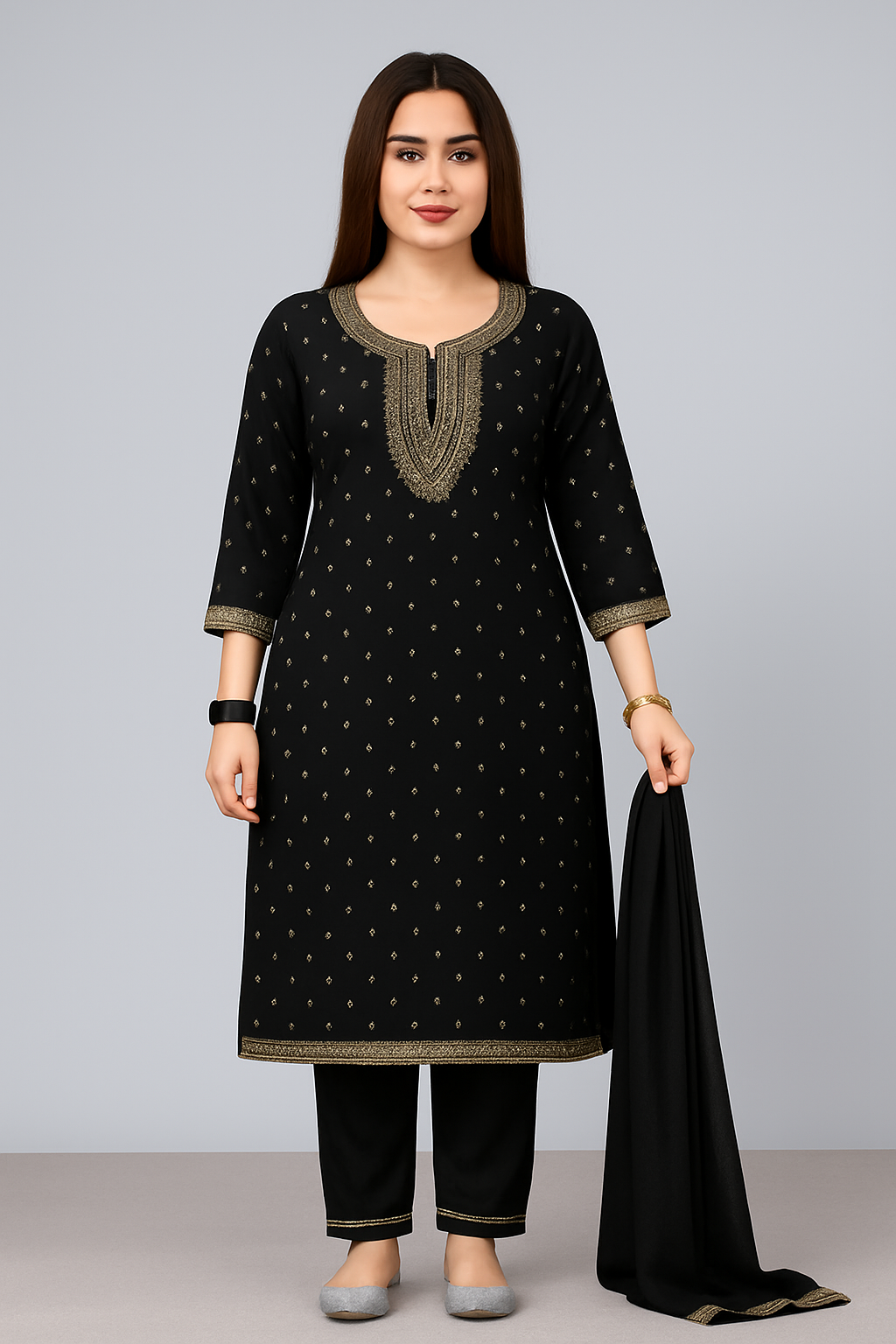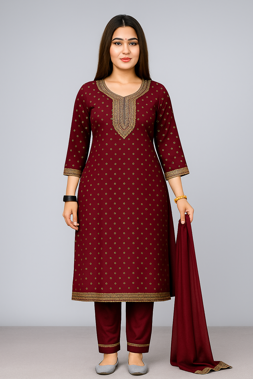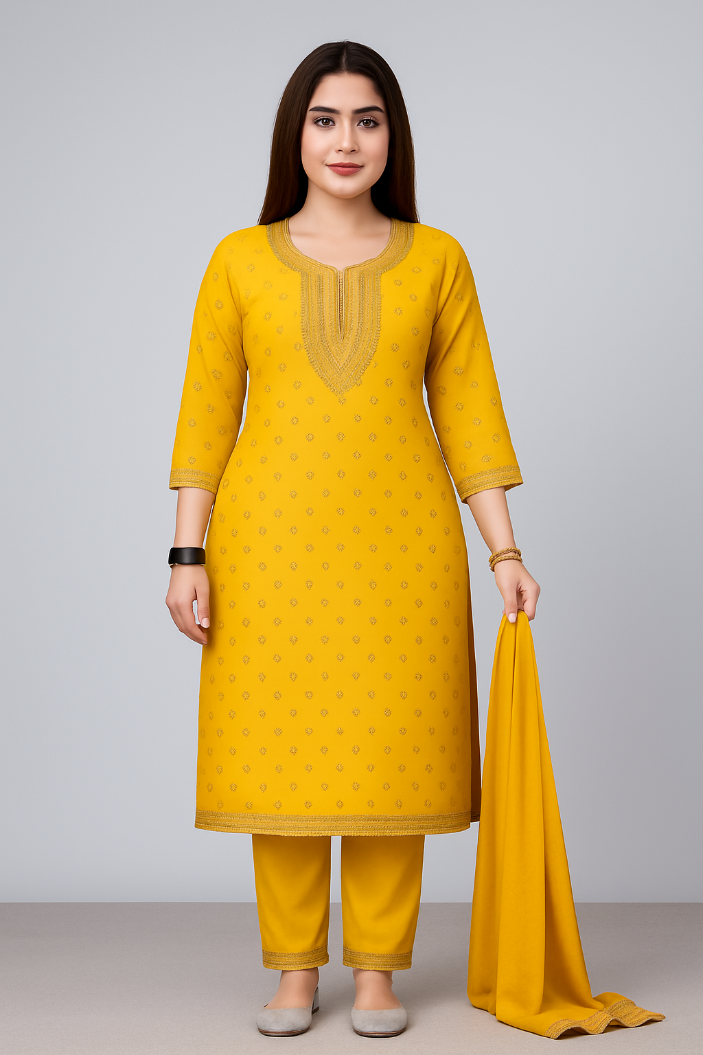 Step into timeless elegance with this stunning embroidered kurti suit set, crafted for those who love classic ethnic fashion with a touch of modern luxury. This straight-cut kurta features intricate golden thread embroidery on a rich fabric, beautifully complemented by a matching dupatta and pants for a complete, sophisticated look.