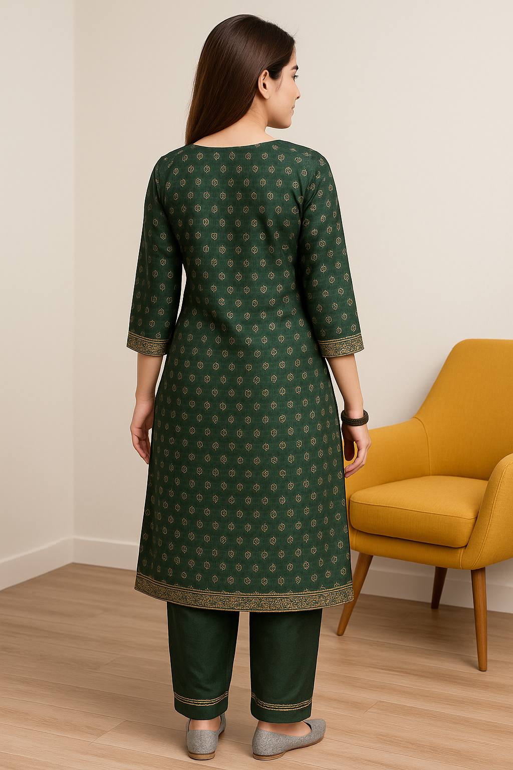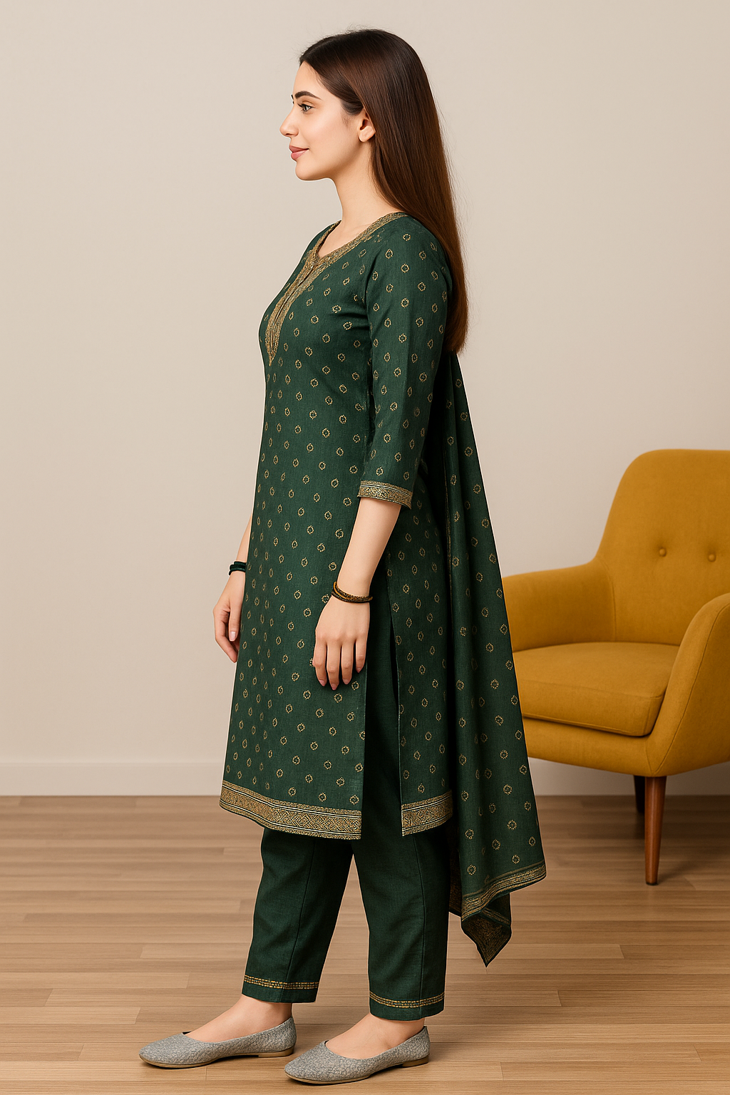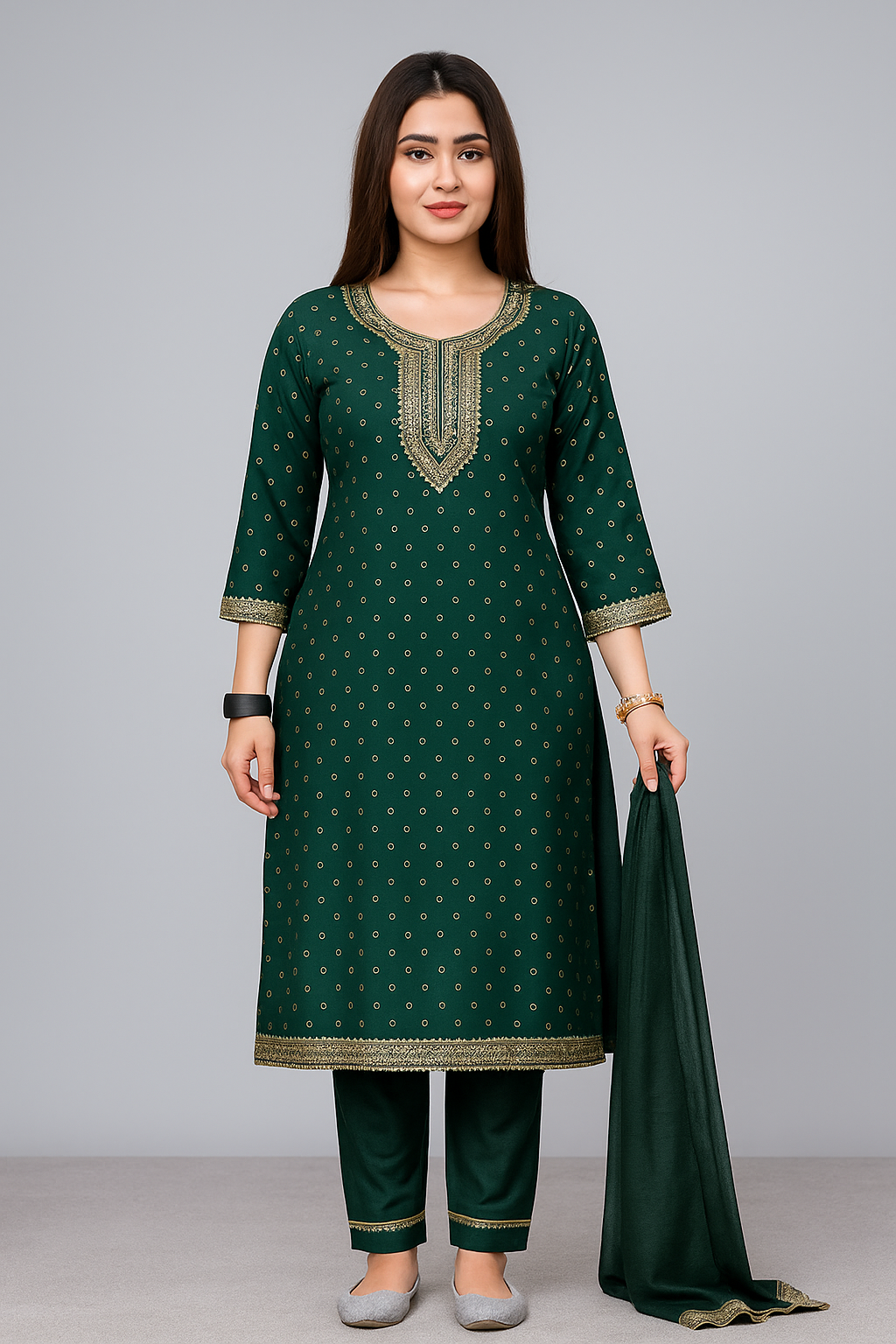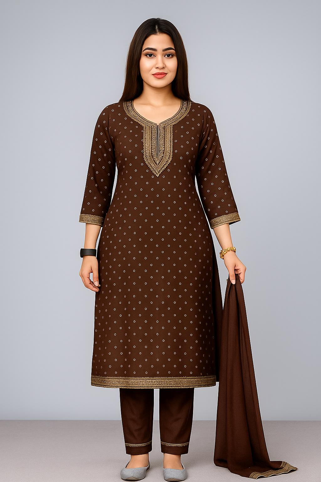 Step into timeless elegance with this stunning embroidered kurti suit set, crafted for those who love classic ethnic fashion with a touch of modern luxury. This straight-cut kurta features intricate golden thread embroidery on a rich fabric, beautifully complemented by a matching dupatta and pants for a complete, sophisticated look.