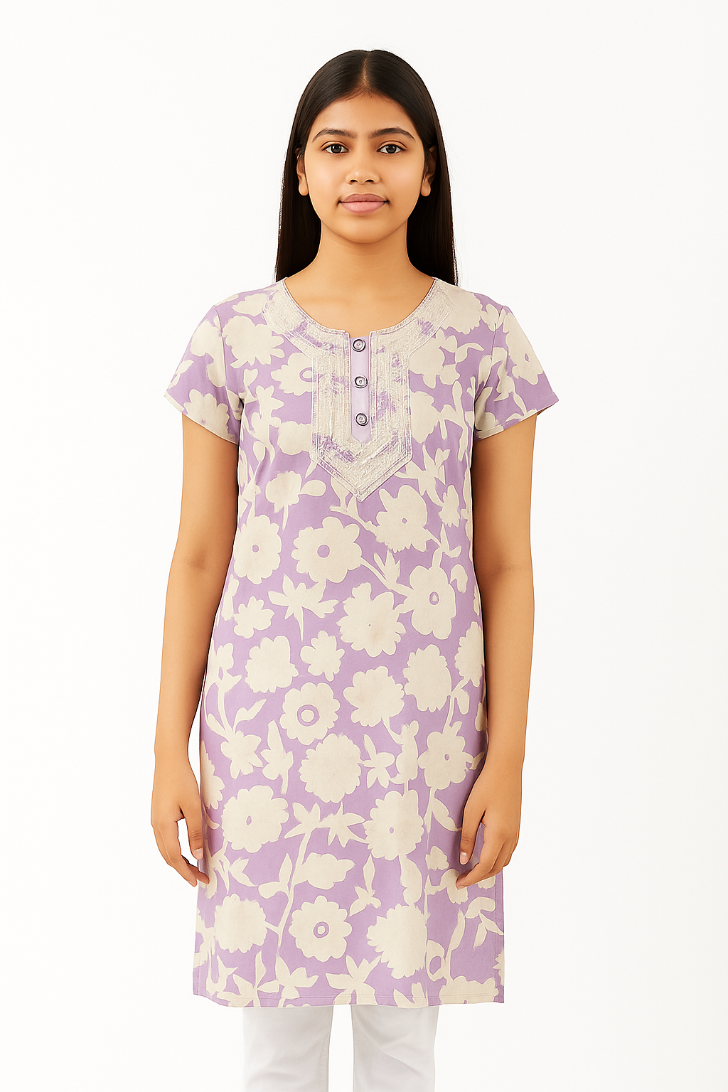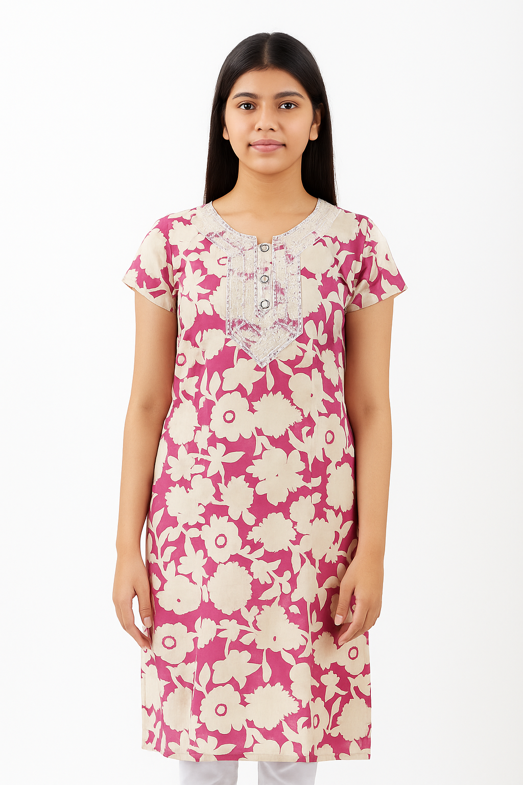 Add this versatile floral kurti to your collection and stay comfortable while looking effortlessly beautiful every day!