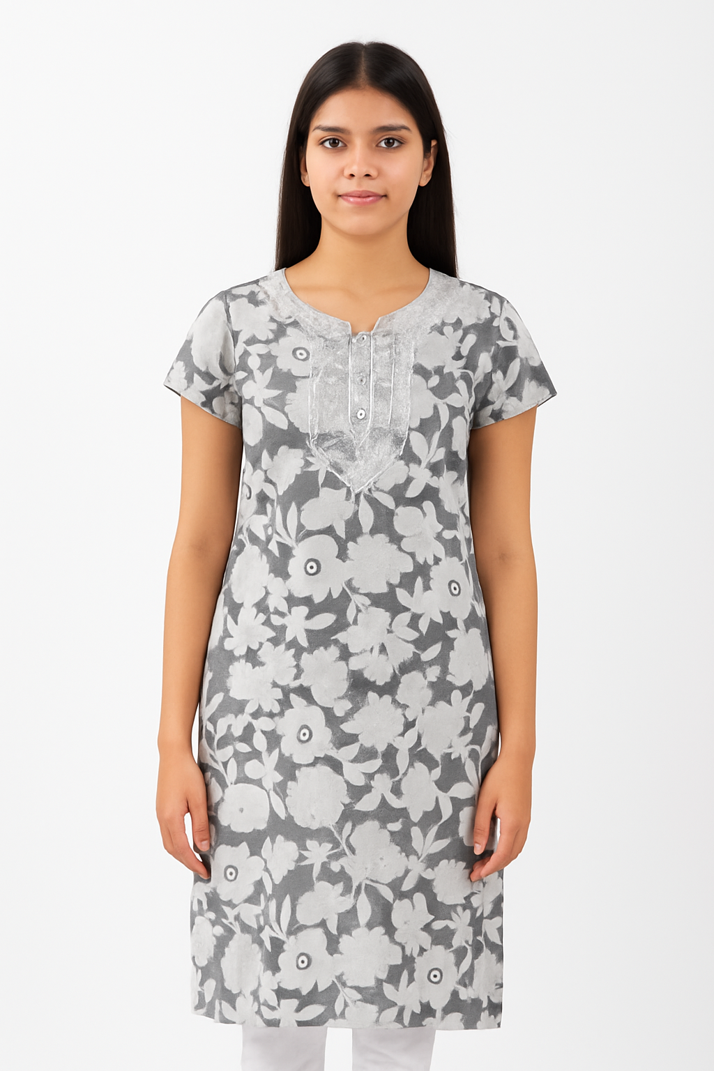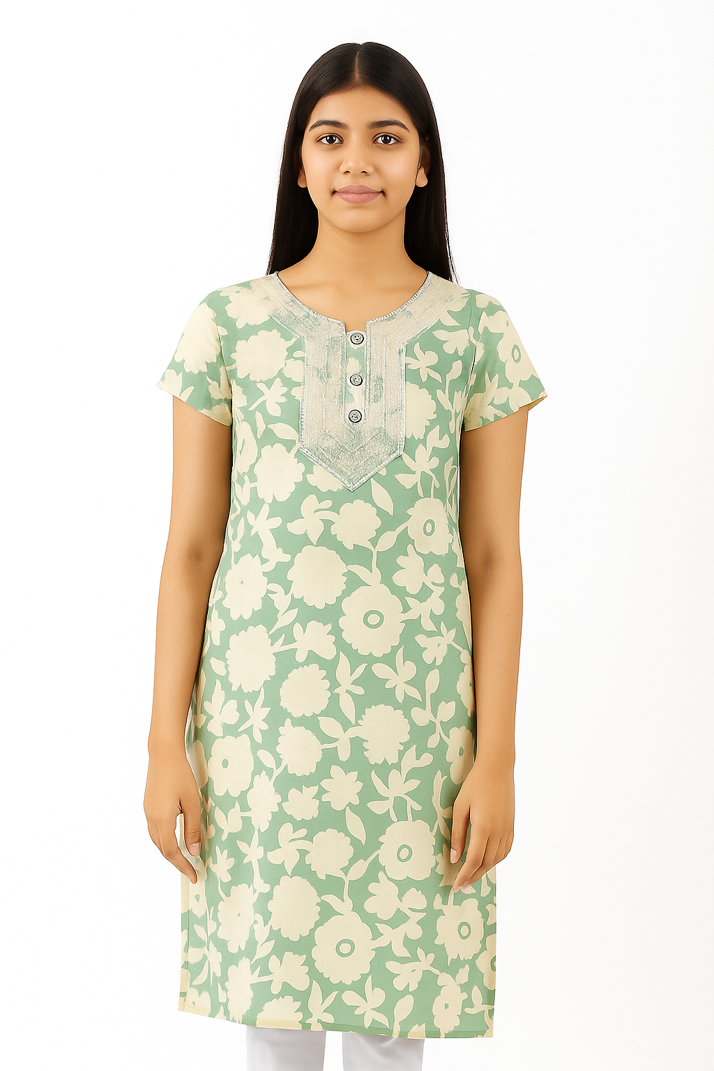 The soothing floral print adds a touch of nature-inspired elegance, while the delicate buttoned neckline detail gives it a stylish twist. With its classic straight cut and short sleeves, this kurti keeps you cool and effortlessly chic all day long.