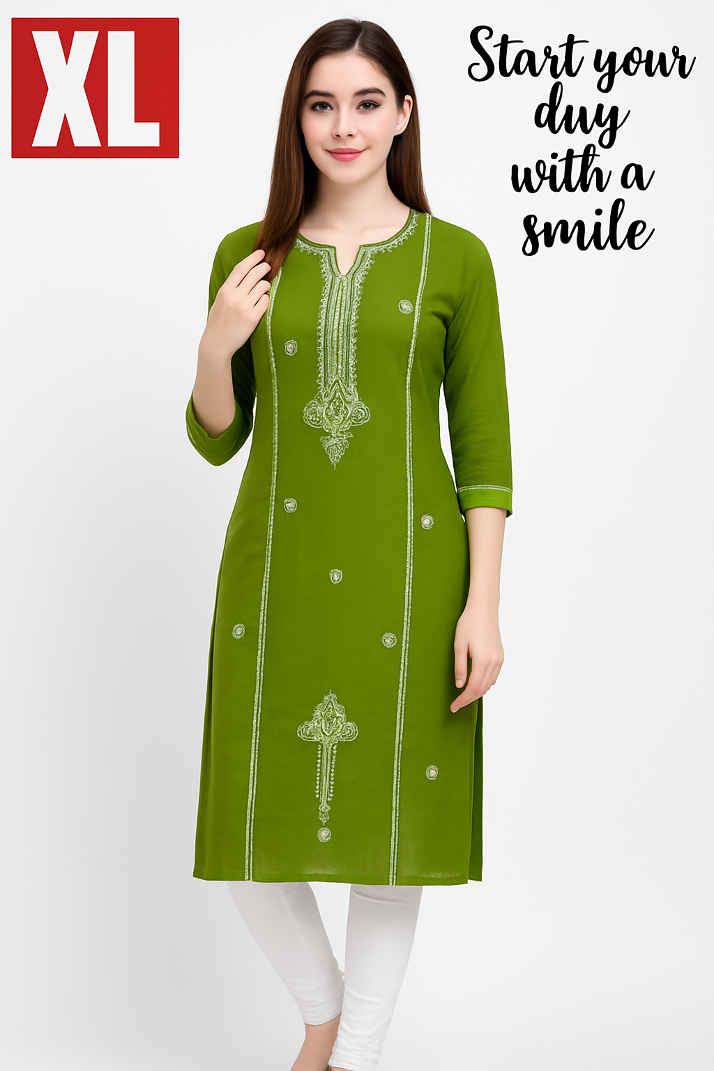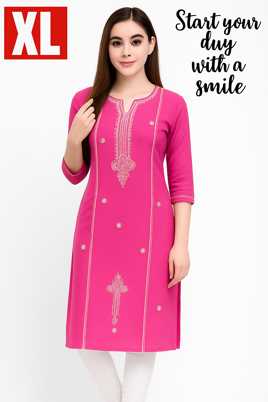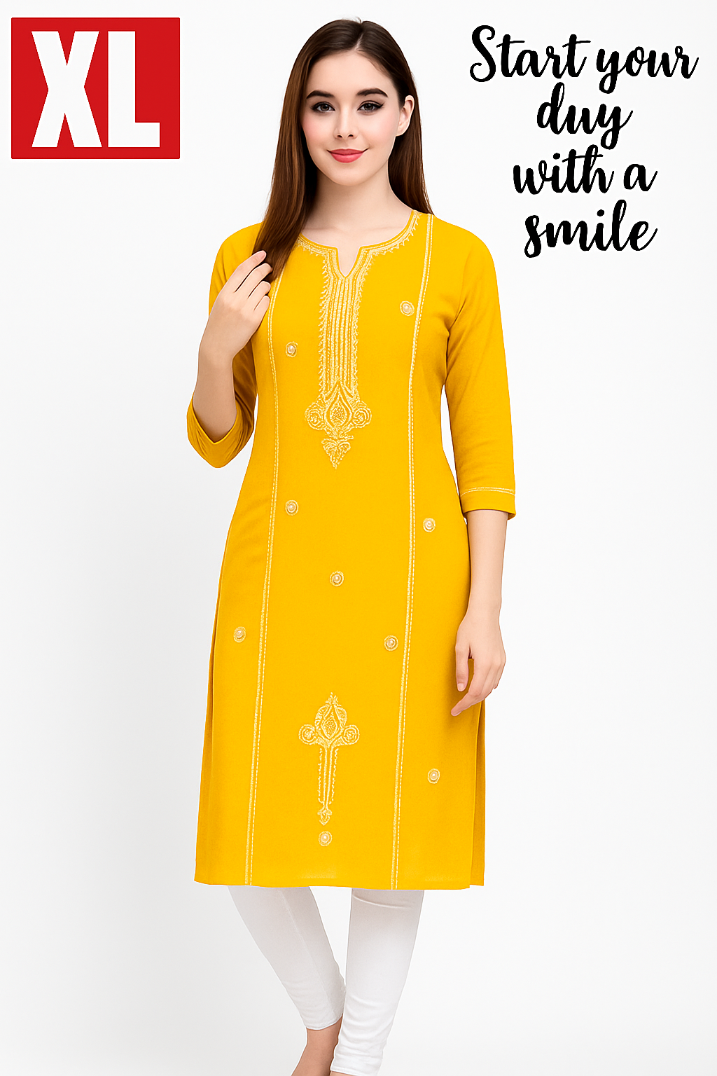 Add a splash of elegance and color to your everyday ethnic wardrobe with this beautifully embroidered straight kurti, available in five stunning shades β Pink, Yellow, Light Green, Dark Green, and Brown. Crafted from comfortable, breathable fabric, this kurti combines traditional charm with a modern silhouette, making it a versatile pick for daily wear, office days, or casual outings.