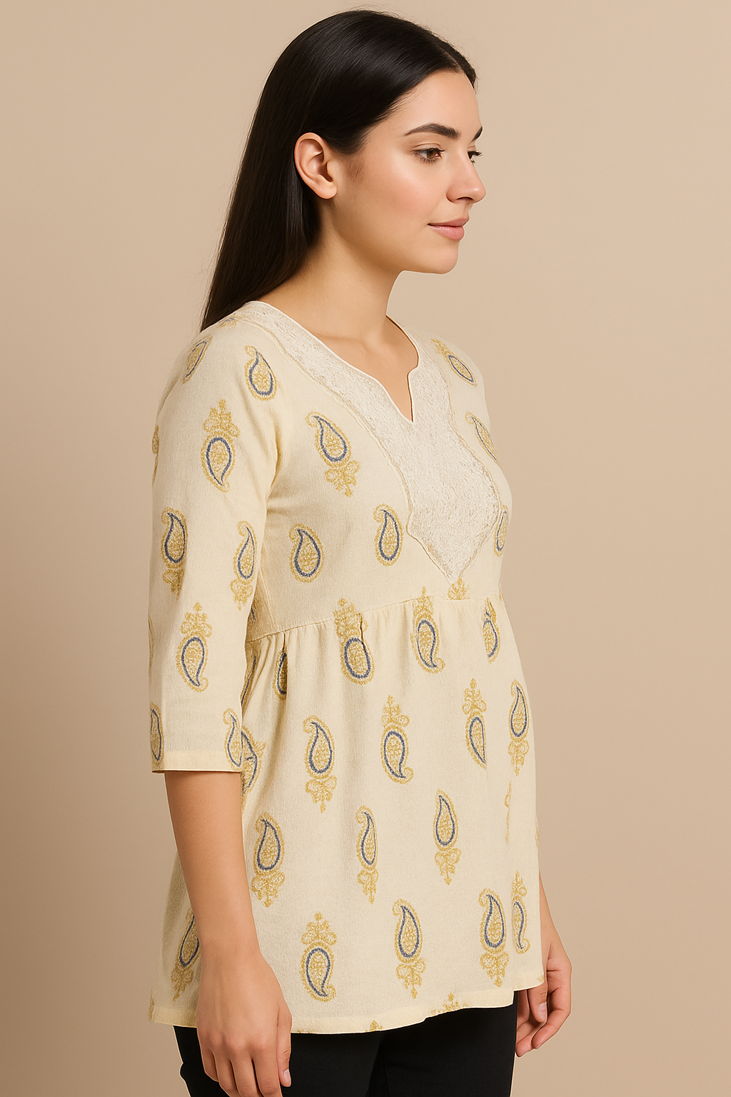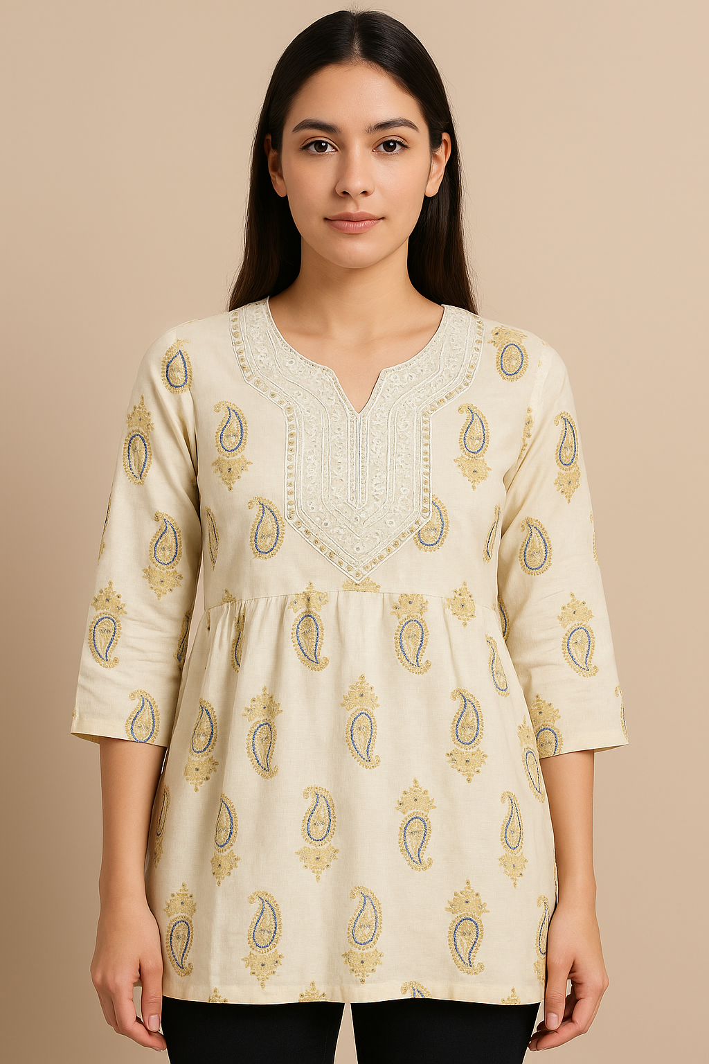 “Timeless Cream Kurti with Royal Paisley Embroidery – Elegant Chic”