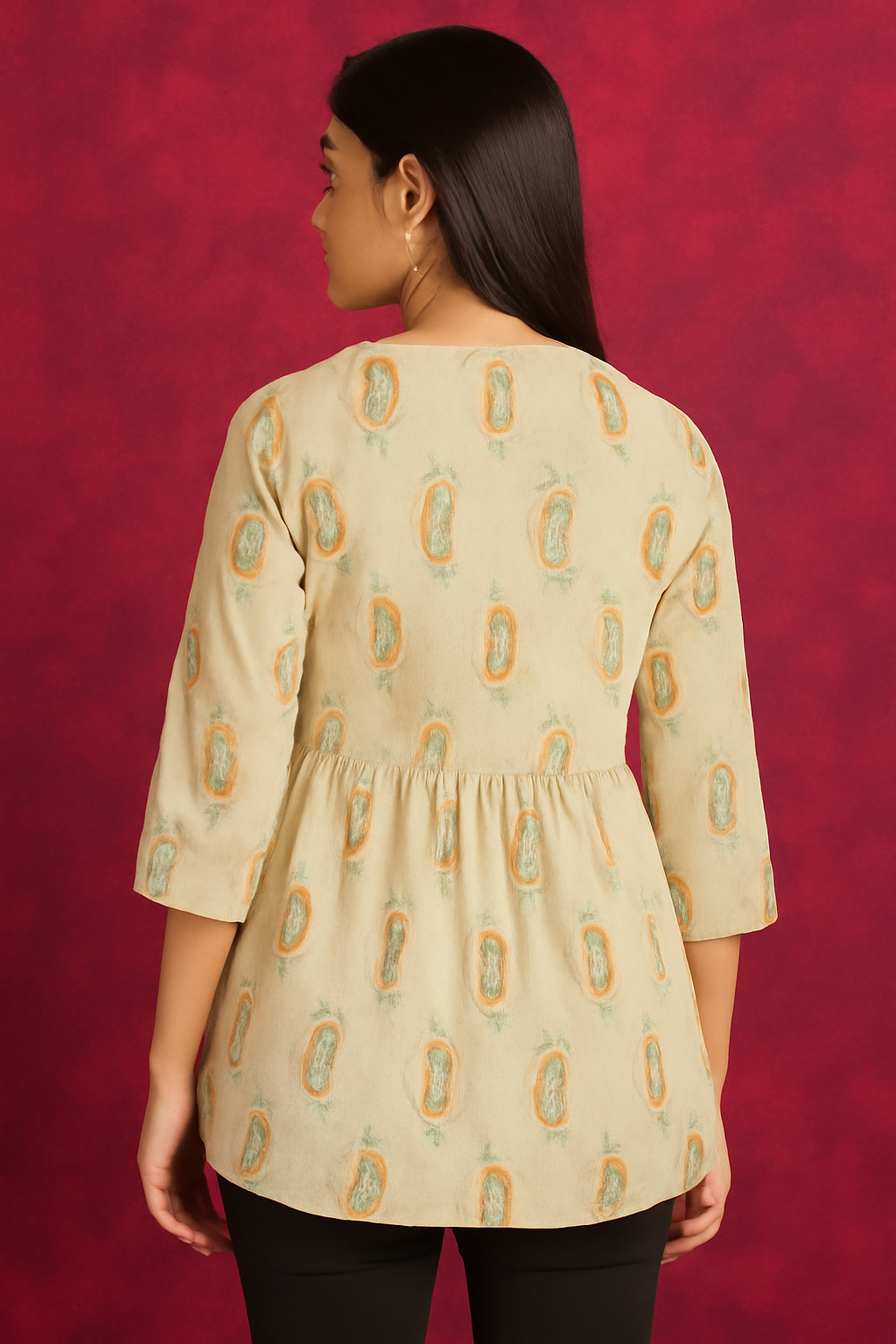 Embrace effortless elegance with this exquisite ivory kurti, thoughtfully crafted for the modern woman who appreciates timeless ethnic style. Made from soft, breathable cotton, this kurti features delicate paisley motifs in subtle pastel tones that add a touch of understated luxury.
